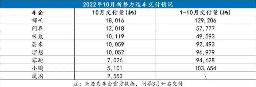 数据显示,“蔚小理”今年前10个月的销量分别为9.2万辆、9.6万辆、10.4万辆。而哪吒汽车和零跑汽车分别交付12.92万辆、9.46万辆,甚至于超过“蔚小理”的趋势。