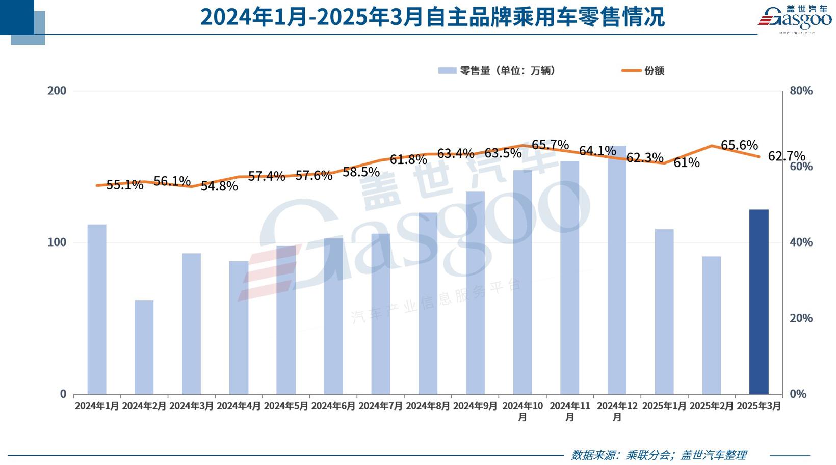 从1-3月的整体情况来看,自主品牌零售市场份额也来到了63%,较去年同期增长7.9个百分点,进一步巩固了其在市场中的主导地位。