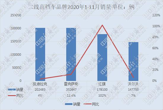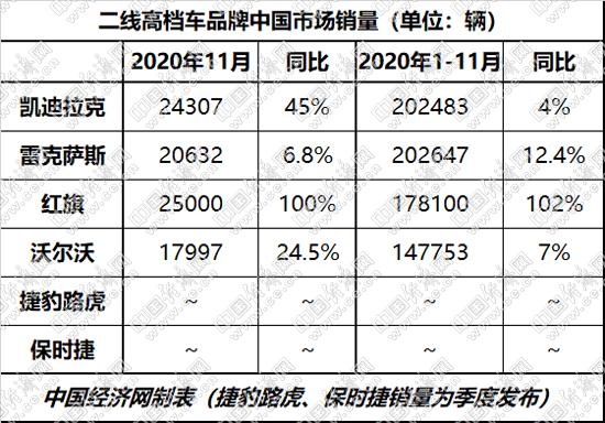 今年前11月,凯迪拉克、雷克萨斯销量均已超过20万辆,红旗也已接近18万辆,全新的“三强”格局愈发稳固,并将推动二线高档车销量在全年的进一步提升。