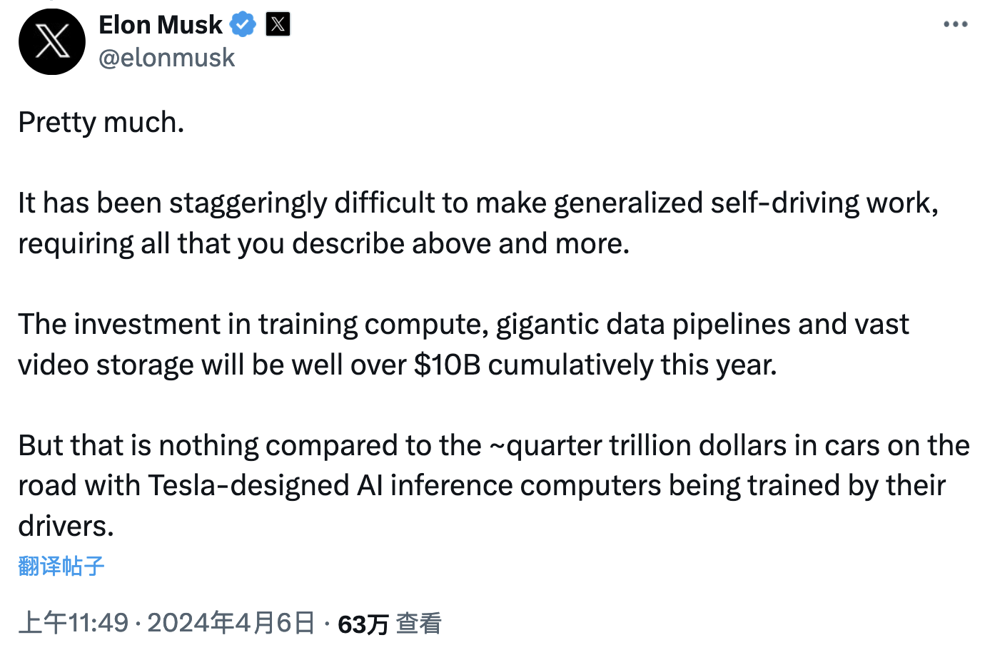 “要实现通用的自动驾驶,难度之大令人咋舌,需要上面描述的所有条件,甚至更多。今年,(特斯拉)在训练计算、庞大的数据管道和海量视频存储方面的累计投资将远远超过100亿美元。但这与道路上行驶的、装有特斯拉设计的AI推理计算机并由驾驶员训练的价值2500亿美元的汽车相比,根本不值得一提。”马斯克写道。