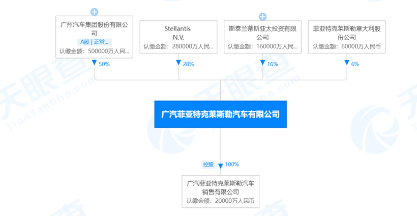 公开资料显示,广汽菲克公司成立于2010年,注册资本100亿元,注册地是湖南长沙。通过股权穿透图可知,该公司由广汽集团、Stellantis N.V.、斯泰兰蒂斯亚太投资公司、菲克意大利股份公司(后三家均为Stellantis旗下公司)等共同持股。